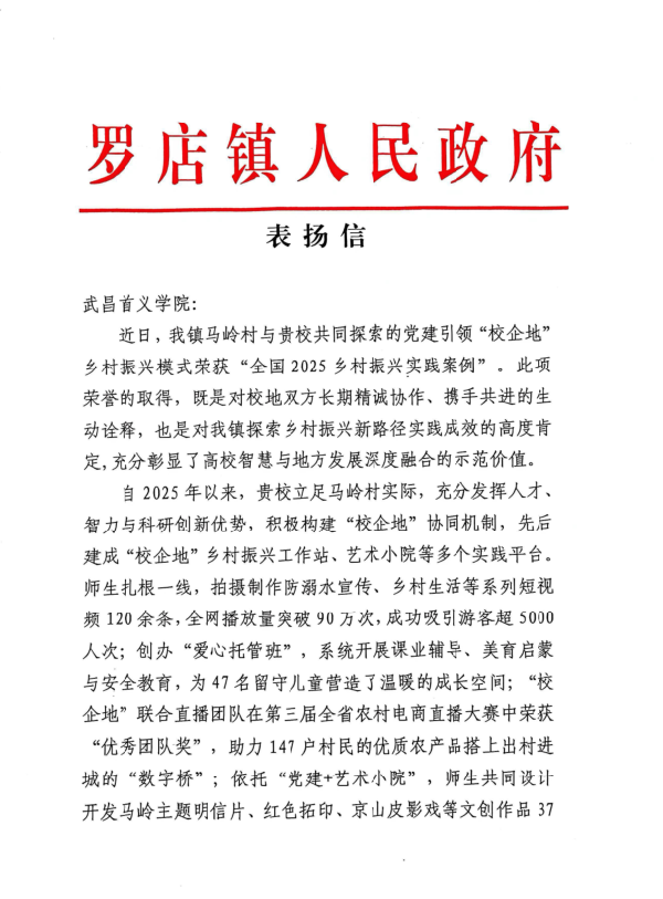 1月21日,学校收到一封来自京山市罗店镇人民政府的表扬信。信中通报我校与马岭村共同...