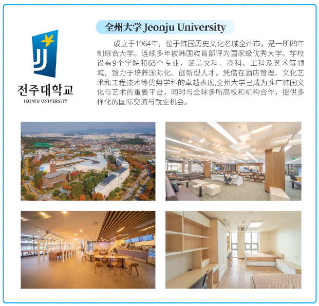为给同学们提供更多海外学习和交流的机会,提升跨文化沟通能力和国际竞争力,根据我校与韩国全州大学合作交流协议,现启动2026年春季赴韩国全州大学交换生项目。通过该项目,学生有机会在全州大学学习一学期,体验当地文化,结识来自不同文化背景的同学,丰富国际化学习经历。现将相关事项通知如下: