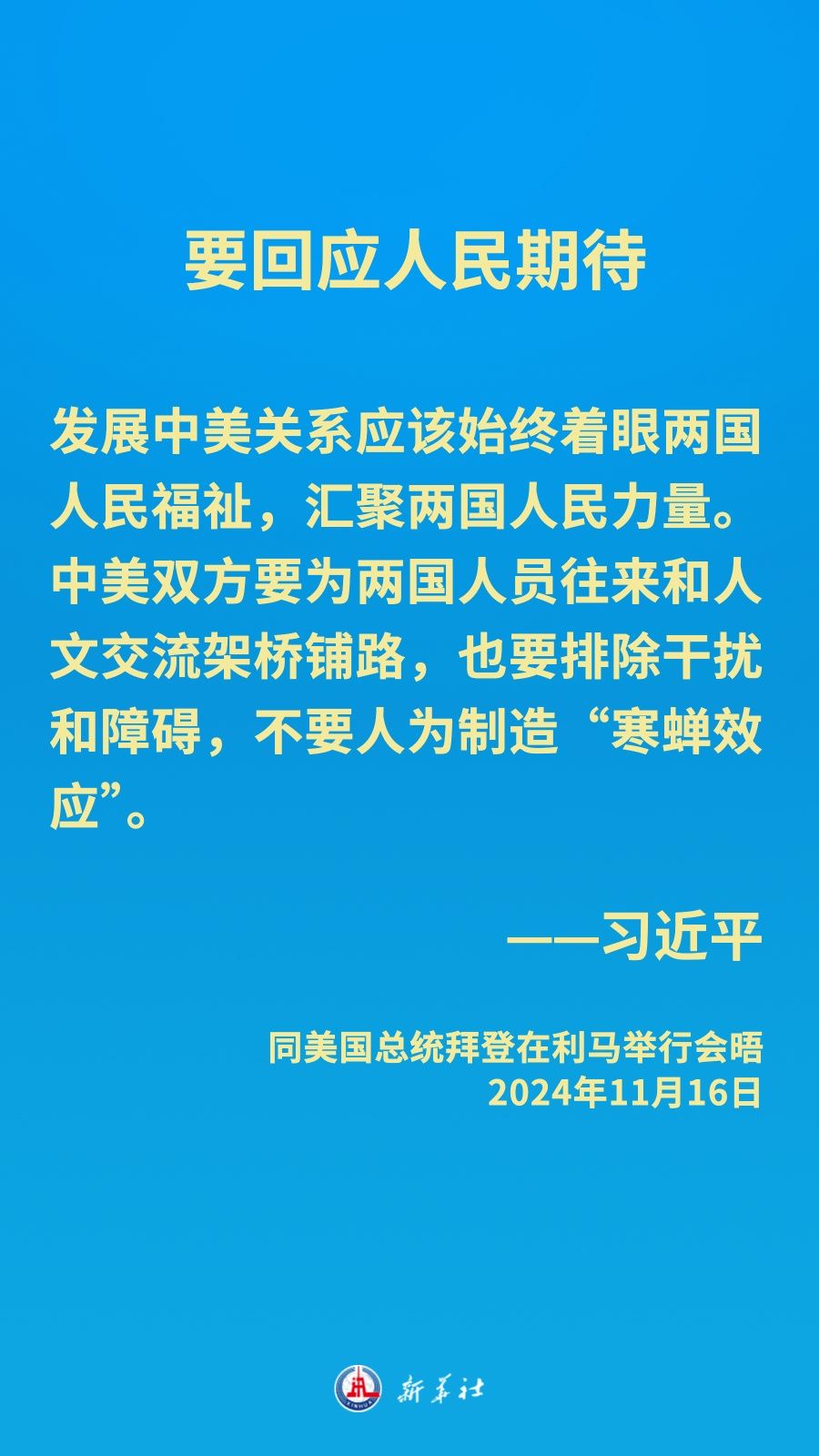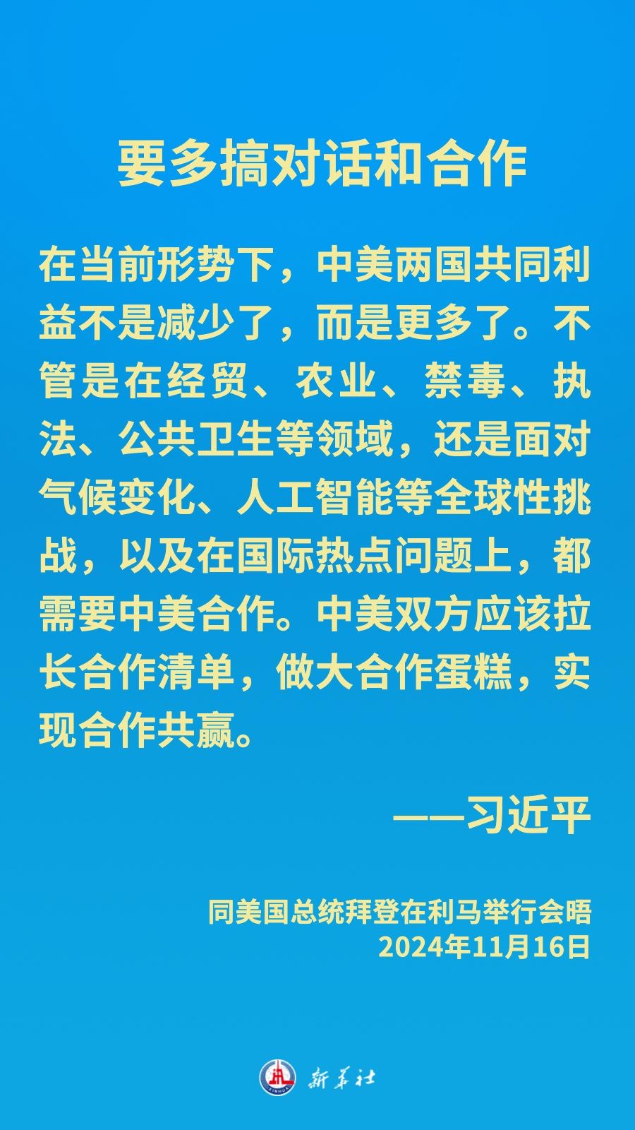 当地时间11月16日下午,国家主席习近平在利马同美国总统拜登举行会晤。新华社记者 李学仁 摄 新华社利马11月16日电(记者韩墨 杨依军)当地时间11月16日下午,国家主席习近平在利马同美国总统拜登举行会晤。 习近平指出,过去4年,中美关系虽然历经跌宕起伏,但也开展了对话和合作,总体实现了稳定。我们指导双方团队通过磋商确定了中美关系的一些指导原则,共同推动两国对话和合作重回正轨,恢复和新建了20多个沟通机制,在外交、安全、经贸、财政、金融、军队、禁毒、执法、农业、气候变化、人文等领域取得了积极成果。 过去4年的经验值得总结、启示需要记取,我认为至少有以下几条。 一是要有正确的战略认知。“修昔底德陷阱”不是历史的宿命,“新冷战”打不得也打不赢,对华遏制不明智、不可取,更不会得逞。 二是要言必信、行必果。人无信不立。中方都是说到做到,但如果美方总是说一套、做一套,对美国的形象很不利,也损害双方互信。 三是要平等相待。中美两个大国交往,任何一方都不能按照自己的意愿改造对方,也不能从所谓“实力地位”出发压制对方,更不能为保持本国的领先地位而剥夺对方正当发展权利。 四是不能挑战红线、底线。中美是两个大国,难免有些矛盾分歧,但不能损害彼此核心利益,更不能搞冲突对抗。一个中国原则和中美三个联合公报是双边关系的政治基础,必须恪守。台湾问题、民主人权、道路制度、发展权利是中方的4条红线,不容挑战。这些是中美关系最重要的防护栏和安全网。 五是要多搞对话和合作。在当前形势下,中美两国共同利益不是减少了,而是更多了。不管是在经贸、农业、禁毒、执法、公共卫生等领域,还是面对气候变化、人工智能等全球性挑战,以及在国际热点问题上,都需要中美合作。中美双方应该拉长合作清单,做大合作蛋糕,实现合作共赢。 六是要回应人民期待。发展中美关系应该始终着眼两国人民福祉,汇聚两国人民力量。中美双方要为两国人员往来和人文交流架桥铺路,也要排除干扰和障碍,不要人为制造“寒蝉效应”。 七是要展现大国担当。中美两国应该时刻考量人类前途命运,为世界和平担当,为全球提供公共产品,为世界团结发挥积极作用,包括开展良性互动、不搞相互消耗、不胁迫别国选边站队。 习近平强调,中美关系的发展历程,印证了中美建交45年来的经验和启示。如果两国做伙伴,求同存异,中美关系就能够取得长足发展。如果把对方当对手,恶性竞争,中美关系就会遭遇波折甚至倒退。当今世界动荡不安、冲突频发,人类面临前所未有的挑战。大国竞争不应是时代底色,团结协作才能共克时艰。“脱钩断链”不是解决之道,互利合作才能共同发展。“小院高墙”不是大国作为,开放共享才能造福人类。中美关系稳定发展既关乎两国人民,也关乎人类前途命运。中美要继续探寻两个大国正确相处之道,实现中美两国在这个星球上长期和平共存,多为世界注入确定性、提供正能量。 习近平强调,中方致力于中美关系稳定、健康、可持续发展的目标没有变,按照相互尊重、和平共处、合作共赢处理中美关系的原则没有变,坚定维护自身主权、安全、发展利益的立场没有变,赓续中美人民传统友谊的愿望没有变。中方愿同美方继续保持对话、拓展合作、管控分歧,延续中美关系来之不易的企稳势头。 习近平就台湾、经贸科技、网络安全、南海、乌克兰危机和朝鲜半岛等问题阐明中方立场。 习近平强调,“台独”分裂行径同台海和平稳定水火不容。美方想要维护台海和平,关键是要认清赖清德和民进党当局的“台独”本性,慎之又慎处理台湾问题,明确反对“台独”,支持中国和平统一。 中国人民的发展权利不可剥夺、不容无视。各国都有维护国家安全的需要,不能泛化国家安全概念,更不能以此为借口对别国恶意设限打压。 所谓中国实施网络攻击,既没有证据,也没有道理。中方本身是国际网络攻击的受害者,一贯反对并打击任何形式的网络攻击。 中方坚决维护南海领土主权和海洋权益。当事方对话协商始终是管控南海争议的最佳方式。美国不应介入有关南沙岛礁的双边争议,不应纵容和支持挑衅冲动。 中方在乌克兰问题上的立场和作为始终光明磊落,就是穿梭斡旋、劝和促谈,为和平而奔走,为推动局势降温而努力。中方不会允许朝鲜半岛生战生乱,不会坐视中国的战略安全和核心利益受到威胁。 当地时间11月16日下午,国家主席习近平在利马同美国总统拜登举行会晤。新华社记者 丁林 摄 拜登表示,美中关系作为世界上最重要的双边关系,不仅事关两国人民,也事关世界的未来。确保美中竞争不演变为冲突,这是美中两国政府对于两国人民和世界肩负的责任。过去4年,美中双方共同努力恢复和新建了一些对话和沟通渠道,包括双方外交和安全团队保持经常性战略沟通,开展坦诚深入对话,为增进双方相互了解发挥有益作用。特别是我们一年前在旧金山会晤以来,双方在军事、禁毒、执法、人工智能、气候变化、人文交流等方面取得实实在在的成果。美中双方相互支持对方主办2026年亚太经合组织领导人非正式会议和二十国集团领导人峰会,展示了美中合作可以给人民带来的福祉。美国不寻求“新冷战”,不寻求改变中国体制,不寻求通过强化同盟关系反对中国,不支持“台