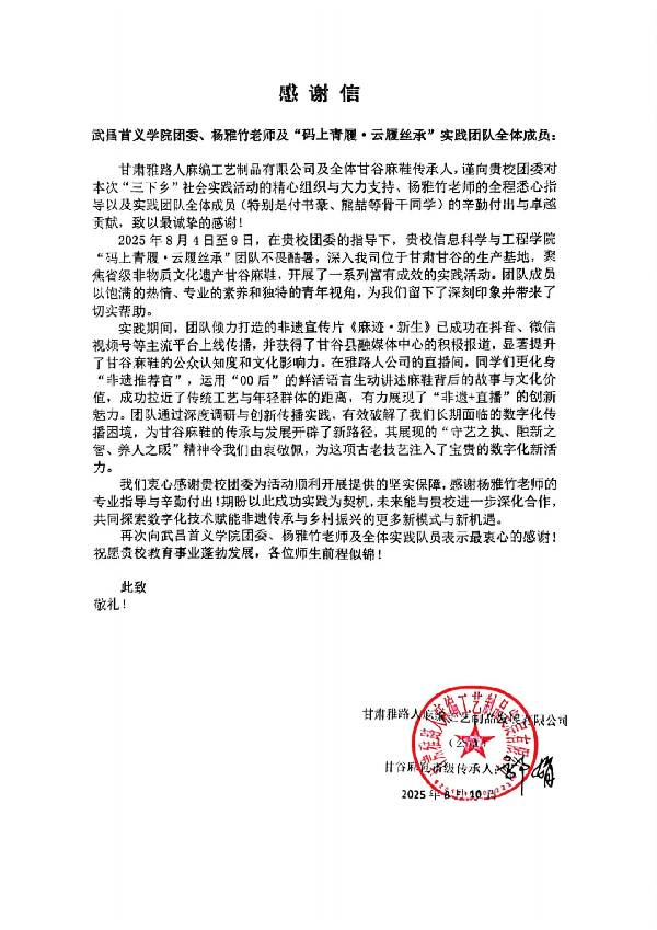 来信对“码上青履·云履丝承”暑期社会实践团队的实践和成果给予高度肯定,“团队以饱满的热情、专业的素养和独特的青年视角,为我们留下深刻印象与带来了切实帮助。团队通过深度调研与创新传播实践,有效破解了我们长期面临的数字化传播困境,为甘谷麻鞋的传承与发展开辟了新路径。”