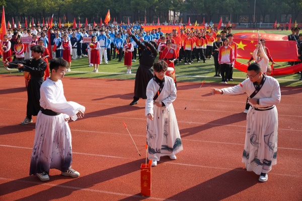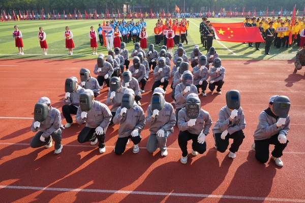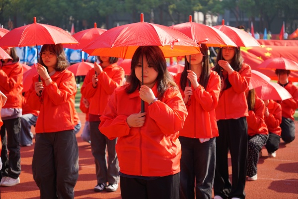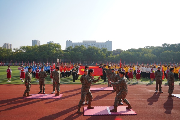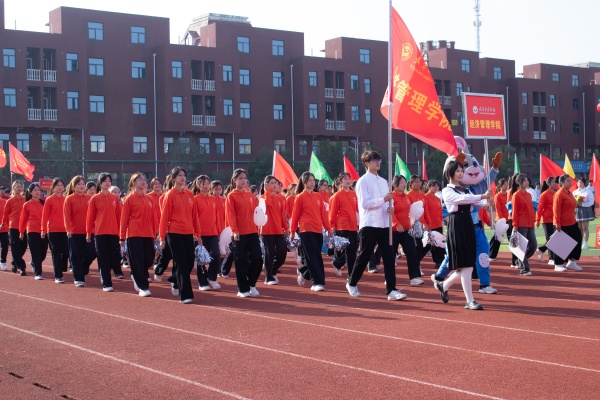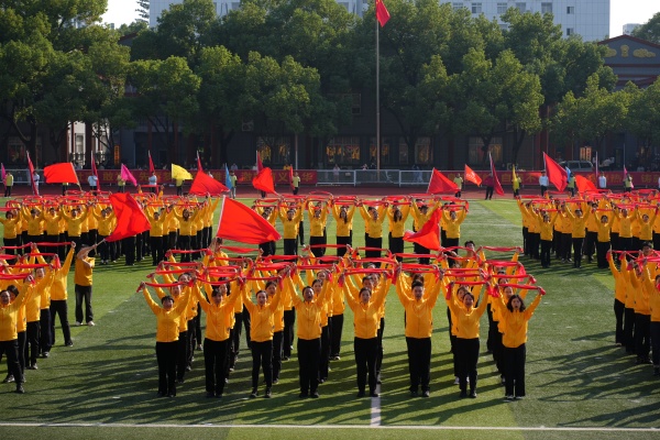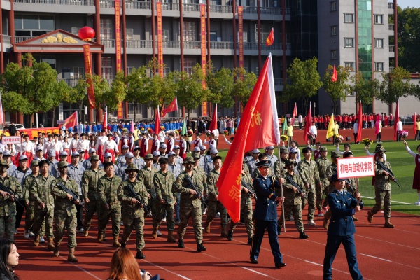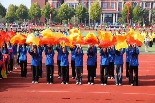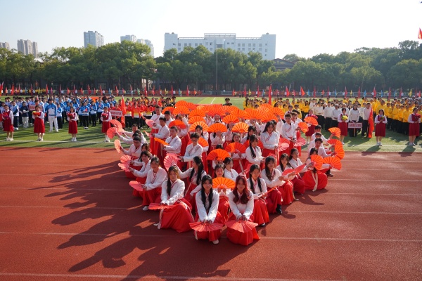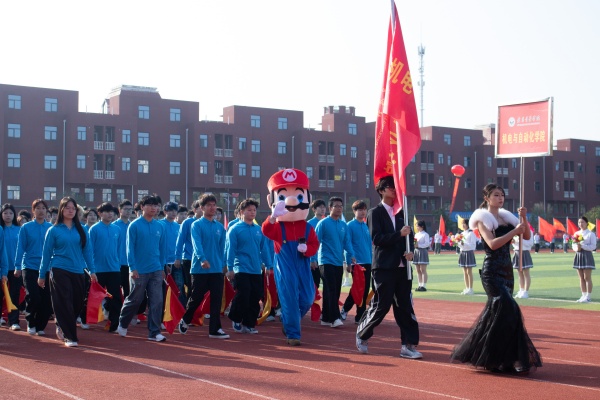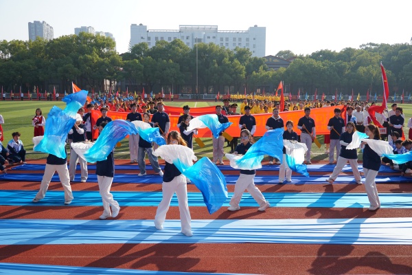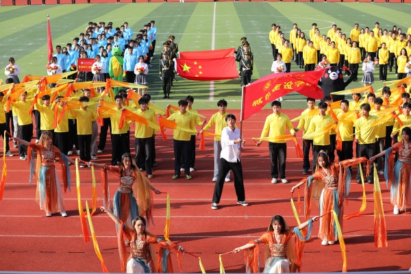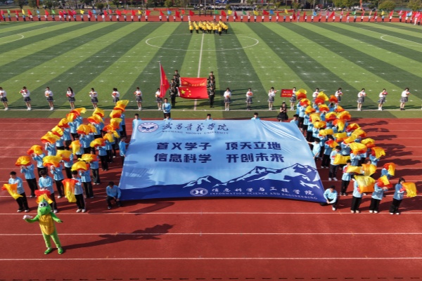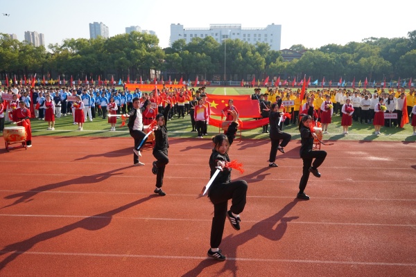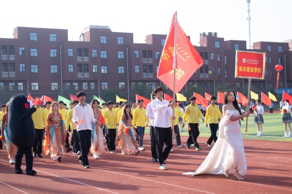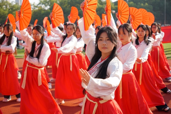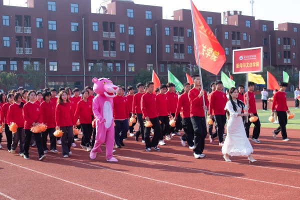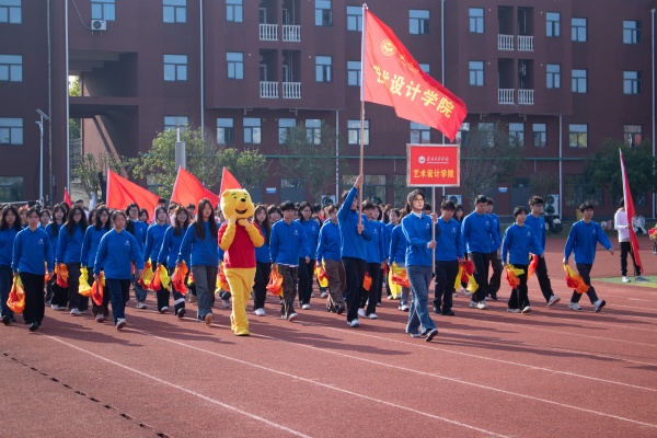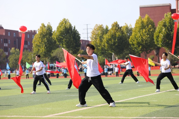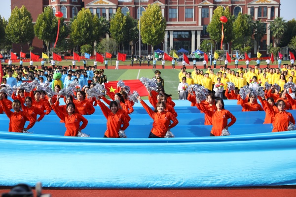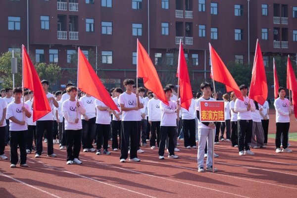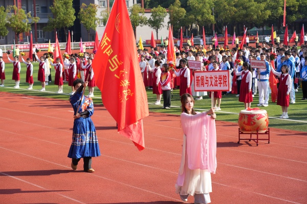 音乐缓缓响起,信息科学与工程学院代表队入场,队员们铺展蓝色绸带化作“海洋”,象征信科学子在知识的海洋中扬帆起航、乘风破浪。机电与自动化学院代表队步伐铿锵入场, 24名退役士兵与无人机侦察方队相映衬,以精彩擒拿术表演尽显退伍不褪色的坚毅与担当。伴随着《霍元甲》的激昂旋律,城市建设学院代表队自信走来,只见折扇舞高昂灵动,刚柔相济间传递着积极进取的青春活力。外国语与教育学院代表队带来绸扇舞表演,传递学院“语通中外,教泽未来”的办学理念与国际化视野。经济管理学院代表队入场,激情四溢的舞蹈表演,点燃青春的激情与活力。新闻与文法学院代表队以“古今运动的传承与演变”为主题,再现了古人运动的雅趣,专业特色与古意今风水乳交融。最后入场的艺术设计学院代表队,他们以一袭红衣亮相,队员手举红伞灵动旋转别有意趣。