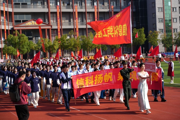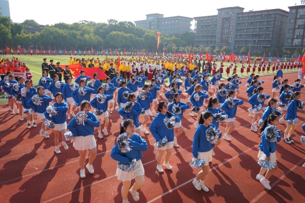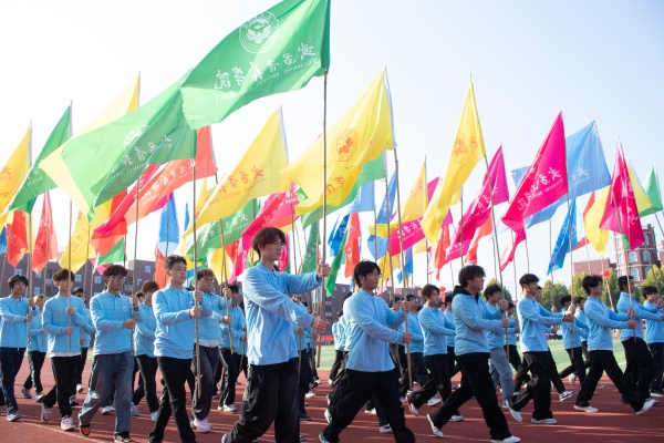 教职工代表队率先出场,他们步伐坚定、气势昂扬,“服务育人强担当,聚力发展谱新章”的口号彰显队伍助力学校高质量发展的信念和决心。信息科学与工程学院代表队自信走来,他们以印有“顶天立地,开创未来”字样的大幅旗帜诠释决心与梦想。机电与自动化学院代表队手持红旗步履坚定,深情致敬祖国。城市建设学院代表队身着敦煌风服饰走来,手中彩带如星河倾泻,翩然舞姿抒发满满的文化自信。外国语与教育学院代表队绸扇翻飞,激情动感,活力四射。经济管理学院代表队随后走来,蓝色幕布中花球舞动,绽放着青春的活力与期许。新闻与文法学院代表队以醒狮跃动入场,动感音乐中腾挪蹦跳,点燃现场气氛。艺术设计学院代表队最后入场,别有风味的扇子舞古韵流淌,尽显中华传统文化魅力。