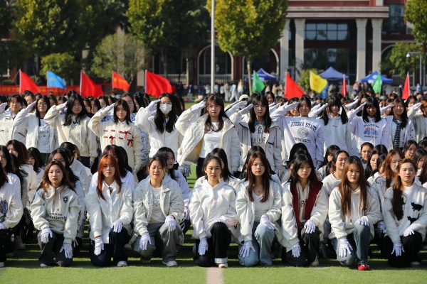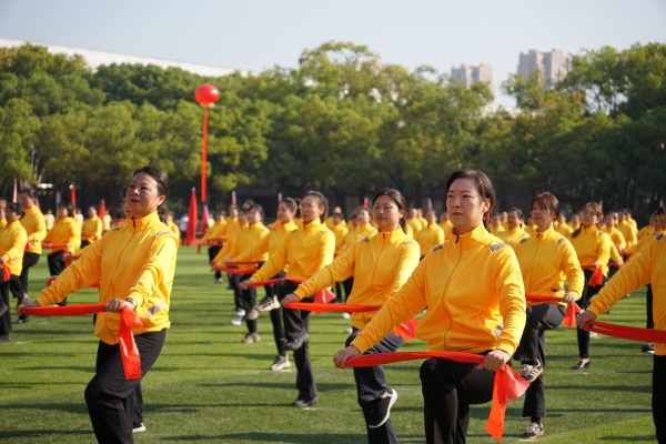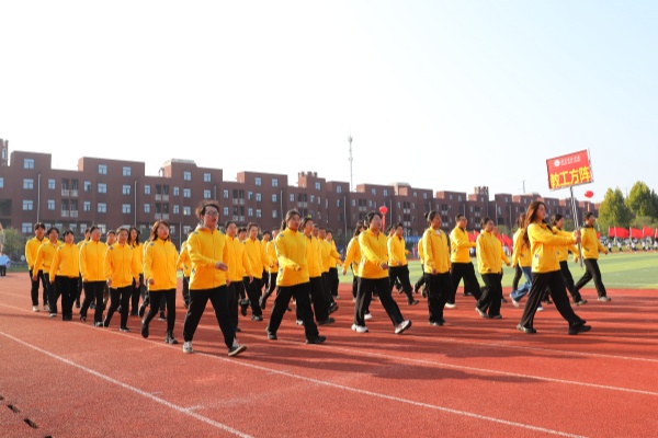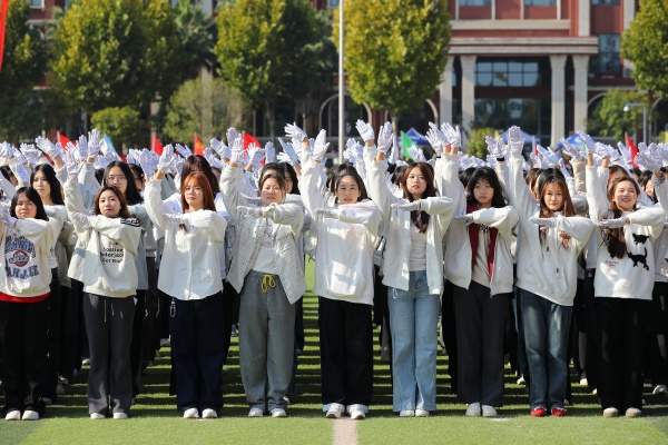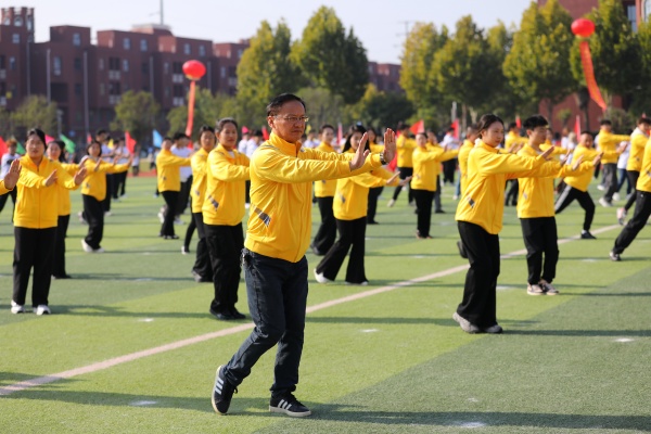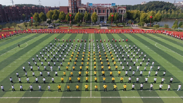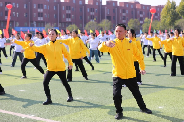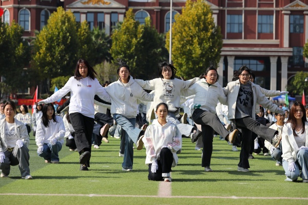 伴着舒缓悠扬的旋律,64名教职工和176名学生组成的方阵,带来的《舒活悦动“力”能聚》太极拳表演缓缓开场。他们起势沉稳、招式圆活,将太极的含蓄内敛和刚柔相济温演绎得淋漓尽致,尽显首义师生从容向上的精神风貌。由新法学院女生组成的方阵带来舞蹈《最美青春》,她们踩着轻快的节拍,灿烂的笑容和着灵动的舞姿,迸发出青春的美丽与魅力。