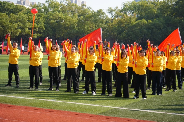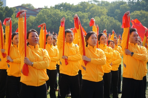 伴着激昂的旋律,400名教职工和20名学生组成的韵律操方队带来《“带”舞山河忆峥嵘》表演,队员们身姿矫健、朝气蓬勃,弹力带绕肩平行拉伸、深蹲肩上推举……这些动作均针对教职工肩颈、手臂等易劳损部位进行编排,配合《黄河大合唱》的背景乐,通过铿锵优美的舞步和动作,传递了全体教职工传承红色精神、践行育人使命的担当与决心。