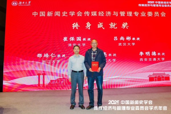 10月18日,中国新闻史学会传媒经济与管理专业委员会2025学术年会在长沙召开。来自全国百余所高校及多家研究机构的专家学者齐聚一堂,深入剖析数智时代传媒产业面临的挑战与机遇,共同探寻媒体系统性变革的路径。年会上,我校新闻与文法学院院长吕尚彬教授荣获学会颁发的“终身成就奖”。这一殊荣不仅是对他研究工作及其成果的高度评价,也是对他在传媒经济与管理领域杰出贡献的高度认同。