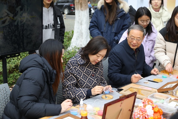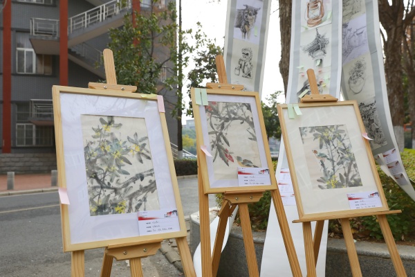 本次展览特别设置了“拾秋·手艺共创” 互动体验活动。参与活动的师生首先通过“拾秋”活动收集落叶、松果、树枝等当季自然素材,根据其自然形态与质感,将相应素材与写生画稿巧妙结合,再以非遗工艺“掐丝珐琅”进行创意创作,一幅幅绽放江南意蕴的作品便油然呈现。