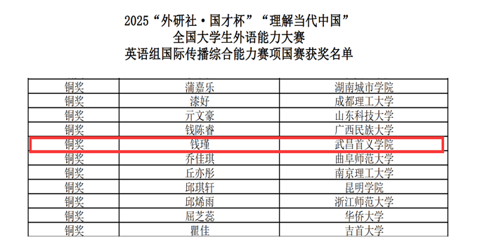 12月8日,“外研社・国才杯”全国大学生外语能力大赛英语组国际传播综合能力赛项圆满落幕。我校外国语与教育学院2022级英语专业钱瑾凭借扎实的语言功底、敏捷的思维与出色的现场表现,从全国顶尖选手中脱颖而出,斩获全国总决赛演讲赛项铜奖。