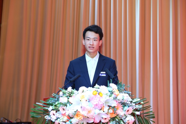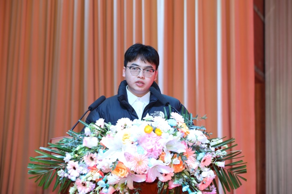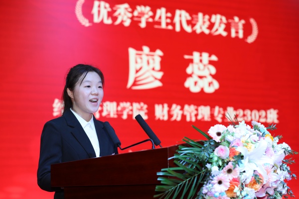 国家励志奖学金获得者代表、经济管理学院财务管理2302班廖蕊的发言饱含感恩与坚韧。来自湖北恩施偏远农村的她,自幼家境清贫,20年来,母亲在餐厅刷盘子供她求学。“一定要好好读书,考上大学”是外公临终前的最后嘱托,也是她前行的力量。初中时,佩戴上团徽的她立下誓言:考上大学,成为一名对社会有贡献的人。步入大学,她坚持勤工俭学减轻母亲负担,她更珍惜学习的每一寸时光,努力学习、虚心求教。她主动挑战学科竞赛,在实践中锤炼本领,用努力换来丰硕成果,连续两年综合考评成绩稳居专业前三,斩获学科竞赛国家级奖项1项、省级奖项3项,获授2项国家发明专利。同时,她用心服务班集体、积极回报社会,将感恩之心化作实际行动。“在逆境中向阳生长,在成长中懂得感恩,用奋斗书写属于青春华章。”最后,她与全体同学共勉。