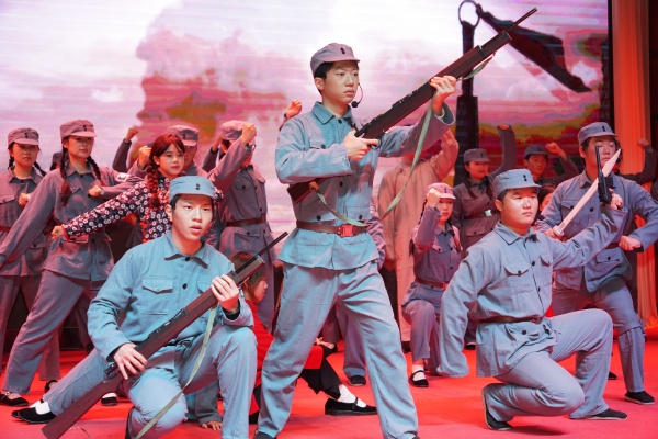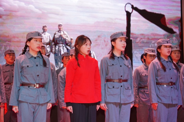 现场,全体师生同上“山河回响,青春奋进”纪念中国人民抗日战争暨世界反法西斯战争胜利80周年思政大课,师生通过朗诵、舞蹈、合唱等艺术形式,重温中国人民抗日战争暨世界反法西斯战争胜利的壮丽史诗。拨转历史的齿轮回到1931年9月18日,日本关东军发动“九一八事变”。情景朗诵《松花江上》深沉回望“九一八”事变后的民族悲怆,让在场学子仿佛置身那段山河破碎的艰难岁月,舒缓的倾诉点燃了学子的爱国情怀。跟随时光的车轮来到1937年“七七事变”后,合唱《太行山上》激昂的歌声唱出抗日军民扎根太行、奋勇抗争的壮志豪情。视线转向1943年,世界反法西斯战争的局势迎来了重大转折,胜利的曙光正穿透硝烟,抗日战争也正逐步从局部战略反攻迈向全面反攻阶段,舞蹈《黄河大合唱》以刚劲的肢体语言,展现了中华儿女“保卫黄河、保卫祖国”的坚定信念和不屈不挠、英勇抗争的精神。红色旋律响彻礼堂,全场大合唱《没有共产党就没有新中国》,师生们用最嘹亮的歌声唱响新时代的最强音。这堂思政大课带领师生穿越时空,重温了那段波澜壮阔的抗战历史,感受先辈们不怕牺牲的斗争精神、炽热的爱国情怀和坚定的理想信念,激励广大青年学生传承红色基因,勇担时代使命,在青春的赛道上奋力奔跑,以实际行动践行“请党放心,强国有我”的青春誓言。