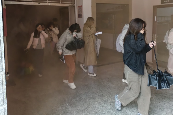 在疏散逃生演练环节,警报响起、烟雾弥漫后,师生们严格按照“捂鼻、弯腰、靠墙走”的七字要领,在工作人员引导下,仅用时1分20秒便全部安全撤离至指定地点。高度仿真的演练使师生亲身体验火场紧迫感,极大强化了应急避险的实战能力。