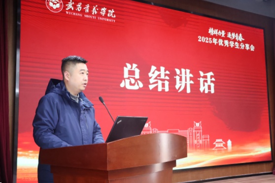 汪晓航在总结讲话中表示,上台分享的五位同学是来自不同领域的优秀代表,他们的表现彰显了高度一致的精神内核,即对卓越目标的追求,对学习成长的热爱,直面困境的坚韧,将个人理想融入集体进步、服务他人成长的自觉担当。他勉励全体同学,向优秀学生学习,将今日的感动与启发,转化为明日脚踏实地的行动。最后,他希望同学们以“志”为帆,锚定奋斗航向;以“韧”为桨,锤炼过硬本领;以“和”为基,涵养集体情怀。