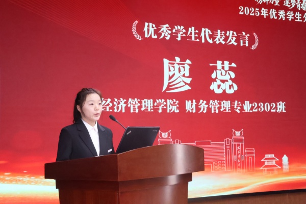 国家励志奖学金获得者代表、经济管理学院财务管理2302班廖蕊的发言饱含感恩与坚韧。来自湖北恩施偏远农村的她,自幼家境清贫,20年来,母亲在餐厅刷盘子供她求学。她牢记外公临终前“一定要好好读书,考上大学”的嘱托,始终发奋前行。初中时,佩戴上团徽的她立下誓言:考上大学,成为一名对社会有贡献的人。步入大学,她坚持勤工俭学减轻母亲负担,更珍惜每一寸时光,努力学习、虚心求教。她主动挑战学科竞赛,用努力换来丰硕成果,连续两年综合考评成绩稳居专业前三,斩获学科竞赛国家级奖1项、省级奖3项,获授2项国家发明专利。同时用心服务班集体、积极回报社会,将感恩之心化作实际行动,“在逆境中向阳生长,在成长中懂得感恩,用奋斗书写属于青春华章。”