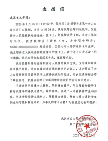 1月31日,学校收到武汉市公安局东西湖区分局第二警务综合服务站送来的表扬信。来信对我校艺术设计学院学生王诗琪路遇老人摔倒,果断伸出援手的善举给予表扬,为学校坚持立德树人,培养向善向好青年点赞。