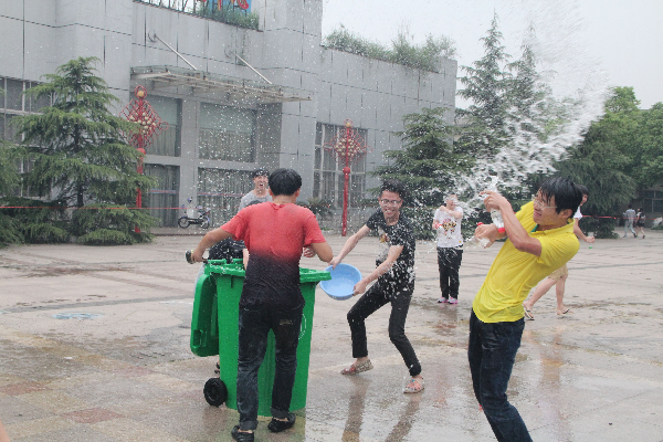 “欢乐泼水节”更是完全激发了同学们的兴趣,参与者可以任意选择小水枪、水瓶、水盆等作为武器。刚开始同学们因为彼此的不熟识而迟迟不敢开动攻击,不知是谁悄悄地将一大盆水洒向天空,打破了同学们之间的尴尬。男生们勇敢的互相泼水,女生也是东看看西瞅瞅随时保持警惕,一旁的老师们也无一幸免,纷纷遭到同学们的“袭击。”浑身滴着水的财管专1403班陈怡伶边擦水边笑着说:“好久没有这样开心的玩过水了,好像又回到了童年时光。在这样炎热的天气里被水浇透也算是真正体验了一回透心凉、心飞扬。”