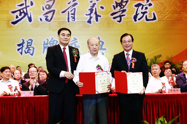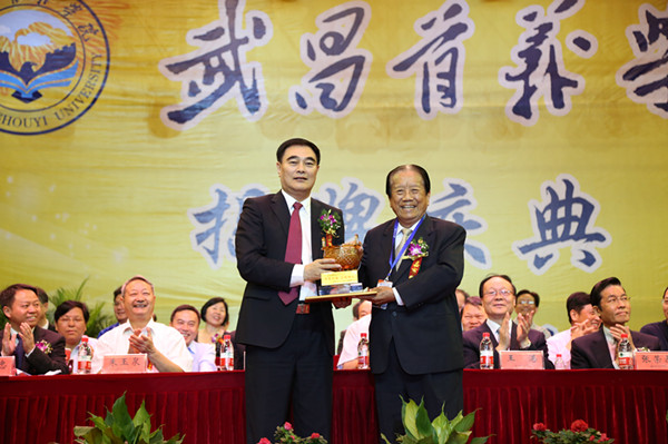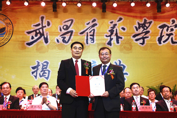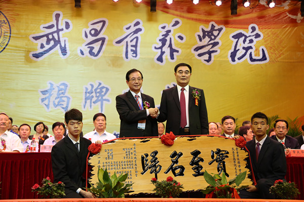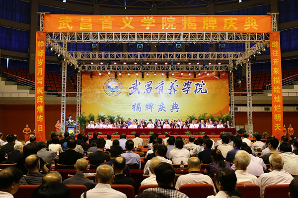 湖北省教育厅发展规划处处长张建军宣读《湖北省人民政府关于同意华中科技大学武昌分校转设为武昌首义学院的通知》。来自海内外的17位专家学者共同为新校名揭牌;校长周进宣读贺信、贺电单位和个人名单;理事长金国华分别向吴清基博士、章开沅教授颁发荣誉校长聘书,向台湾华夏科技大学郭景致教授颁发特聘专职副校长聘书;校长周进为台湾国立勤益科技大学杨善国教授等5名代表颁发专兼职教授聘书;吴清基博士向我校赠送“实至名归”匾额,台湾建国科技大学等高校向我校赠送贺礼。
