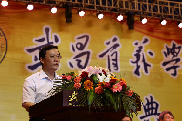 湖北省教育厅副厅长徐雁冰代表湖北省委高校工委、湖北省教育厅感谢华中科技大学对学校的发展作出的贡献,感谢武汉军威集团对教育发展的投入,感谢台湾人士对湖北教育的支持。他从“基因好”、“团队好”、“校风好”等三方面盛赞我校办学15年的成绩,并对学校发展寄予殷切希望。