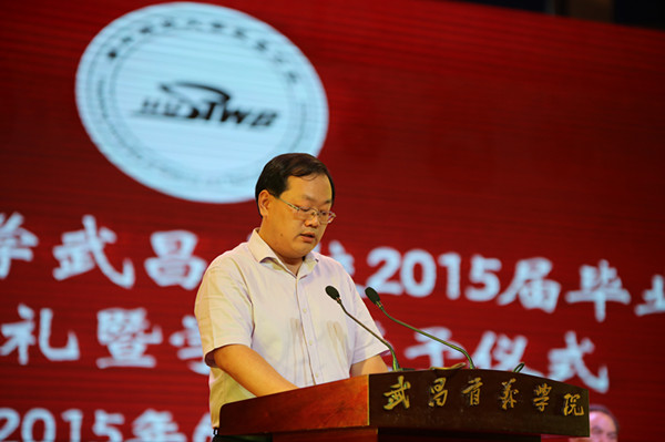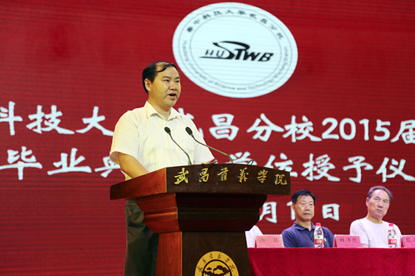 毕业生家长代表、机电与自动化学院自动化专业1101班李想同学的父亲李开胜先生发言。他坦言四年前面对武昌分校的录取通知书,父子俩都有些犹豫,当学校以悠久的底蕴、雄厚的办学力量、较强的科研实力连续十年蝉联全国独立学院排行榜榜首时,他深切感受到学校的办学实力。而今,当自己的孩子被武汉理工大学录取为硕士研究生时,他满是感谢,感谢默默付出的老师,感谢学校领导。他希望毕业生能够响应“大众创业,万众创新”的号召,将聪明才智投入到事业中去。