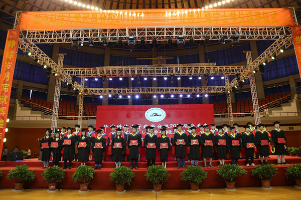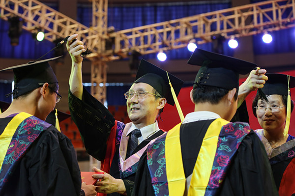 在高昂奋进的音乐中,校领导和各教学单位负责人为2739名毕业生授学位、拨流苏,并握手祝福。学士学位授予仪式在《毕业歌》声中圆满落幕。