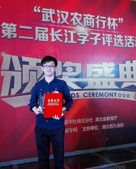 6月26日,“武汉农商行杯”第二届长江学子评选活动颁奖典礼在武昌新华沙龙隆重举行。我校2015届毕业生魏嘉威荣获“长江学子创业奖”。