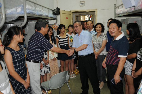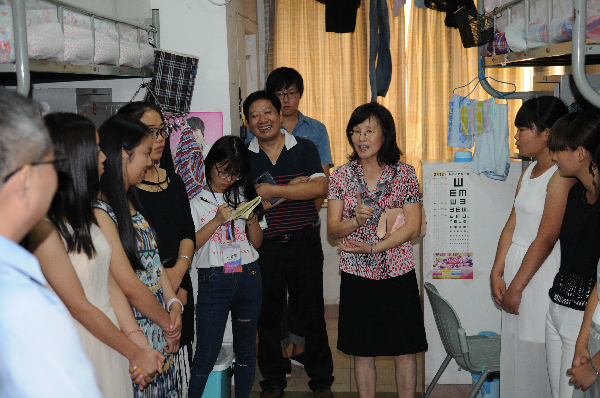8日下午,校长周进,副校长李桂兰、郭景致、金国杰,及相关职能部门负责人到学生公寓看望新生。在中区14栋女生寝室,周校长亲切询问了饮用水、热水器等生活设施的使用情况,强调遇到困难要与学校、老师联系,学校一定会尽全力解决。她特别说道,武昌首义学院全体师生就是一家人。在中区16栋男生宿舍,校长们还没走进门就受到了同学们的热烈欢迎,对于领导们的关怀,土木专业的一位男同学敞开心扉,讲述了自己对新学校新环境的感受和看法,并表示一定通过大学四年的努力学习实现人生理想。
