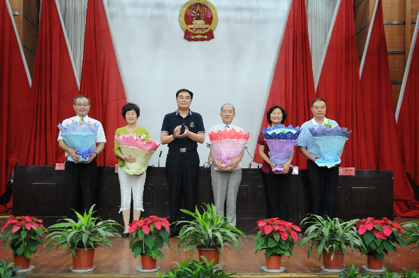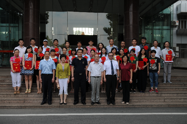 会后,获表彰的教师代表同全体校领导合影留念。