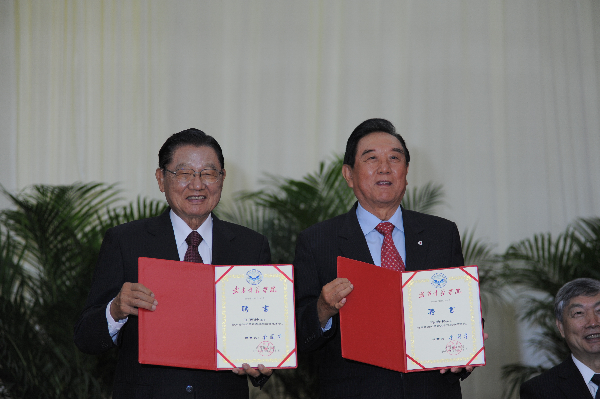 湖北省台办徐元宏副主任宣读《关于同意在武昌首义学院设立湖北省海峡两岸交流基地的批复》。刘凯春主任为“湖北省海峡两岸交流基地”授牌,金国华理事长代表学校接受匾额,江丙坤、陈云林见证授牌仪式。