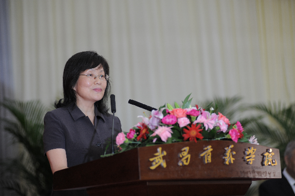 周进校长致辞,她说,湖北省海峡两岸交流基地落户我校,是国台办、省台办对我校在海峡两岸交流方面所做工作的充分肯定,更是对我校的信任、厚望和鞭策,同时也意味着学校在海峡两岸交流方面将拥有更为广阔的前景。武昌首义学院秉承辛亥首义敢为天下先的精神,积极探索办学新模式,开拓海峡两岸交流合作新形式。早在2008年,率先成立了全国首家台资企业人才培养基地,为百余家台企培养输送了大量技术型人才。希望借助海峡两岸交流基地这个平台,积极吸纳台湾教育界的优秀资源,与台湾高校在师生互访、学术研讨以及教育理念、方式等方面加强交流,进一步丰富合作形式不断提升交流层次和水平。