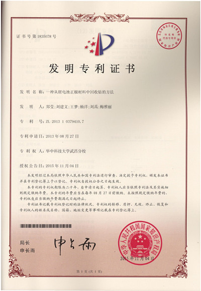 日前,第一发明人为我校城建学院郑莹老师申请的“一种从锂电池正极材料中回收钴的方法”专利,经中华人民共和国国家知识产权局专利审查局严格审查,获得授权并颁发发明专利证书。