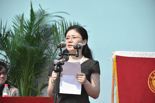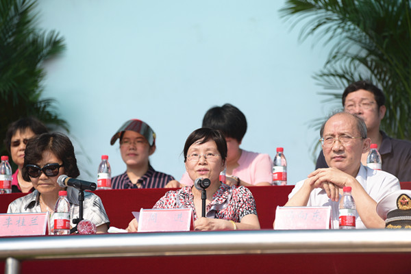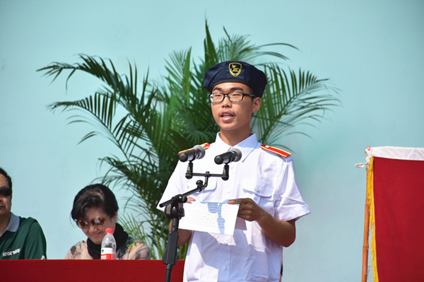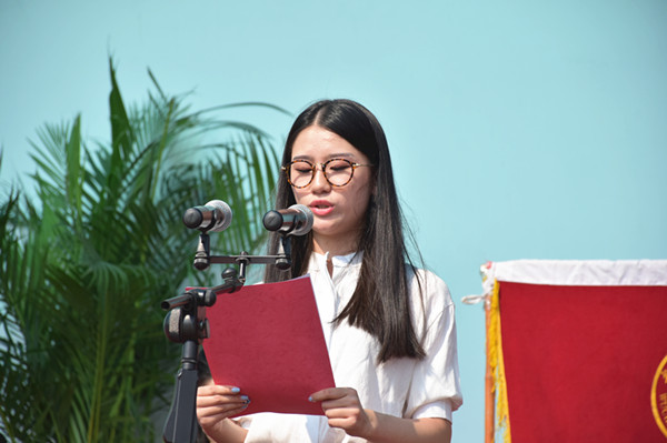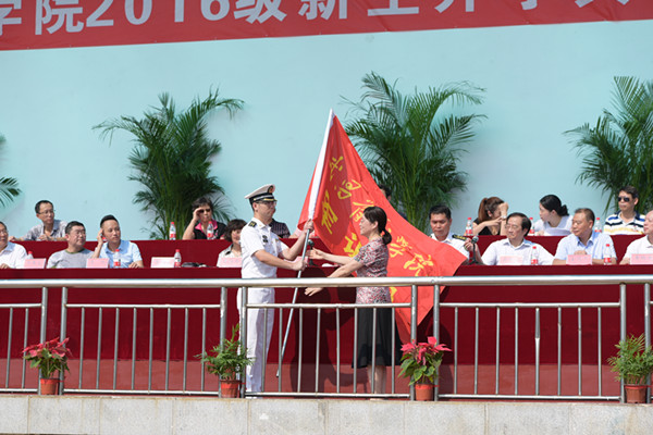 新老生代表和教师代表分别上台发言。随后,周进校长宣布军训机构组成并代表学校授予军训团团旗。