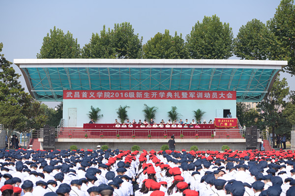 庄严的升旗仪式后,周进校长致辞。她首先对参训的全体新生表示热烈欢迎,并代表全校师生员工向承担本次军训任务的海军工程大学领导和教官们致以诚挚问候和衷心感谢。她说,我校始终坚持培养高素质应用型人才的办学理念,十六年的改革建设使学校各方面获得了长足发展,已经培养并向社会输送了近五万名本专科毕业生,他们在各自工作岗位上都收获了傲人成绩。在校生积极参与社区服务、支教等活动,也敢于在全国性大赛上与各名校学生同台竞技,用优异成绩为学校赢得良好的社会声誉。学校以“首义”命名,是为了传承和弘扬武昌起义“敢为天下先”的精神,努力营造敢于改革、敢于创新的校园文化。周校长寄语新生,希望能严格要求自己,全力以赴,在四年后能够顺利完成学业,与学校共同创造新的精彩。她最后强调,大学的第一堂课就是军训,希望同学们多学习中国人民解放军的优良作风传统,尽快融入集体,努力完成军训任务。