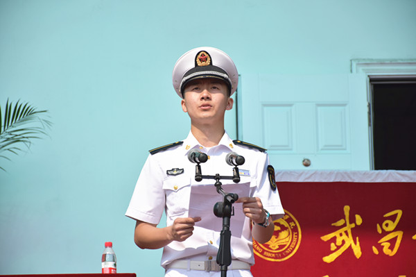 教官代表杨孟春发言。他代表全体教官表决心,从自身做起,严于律己做好榜样,履行好教官职责,完成好训练任务,用兄长之情关爱同学,并希望大家携手同心完成军训。