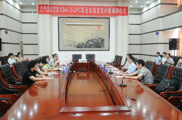 9月19日上午10点,学校与ALTERA公司EDA/SOPC联合实验室签约暨揭牌仪式在行政楼八楼会议室隆重举行。ALTERA公司大学计划中国区总经理陈卫中、华中地区EDA/SOPC协会秘书长扬志方以及湖北鑫合欣科技有限公司总经理孙建飞,我校校长周进、信科院院长黄瑞光、副院长王育勤、院党总支副书记赵瑜、院实验实训中心主任吴林玲出席仪式。信科院院长黄瑞光主持仪式。