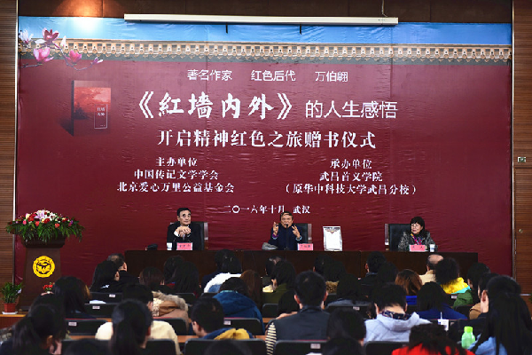 10月31日上午,著名作家、红色后代万伯翱先生新作《红墙内外》签名赠书仪式在校举行。中国传记文学学会荣誉会长、北京爱心万里公益基金会理事长万伯翱,学校理事长金国华,校长周进,副校长李桂兰、金国杰,党委副书记邹星庐等参加赠书仪式。湖北日报、楚天都市报、武汉晨报、人民网、湖北电视台、武汉电视台等媒体单位对活动进行了采访报道。