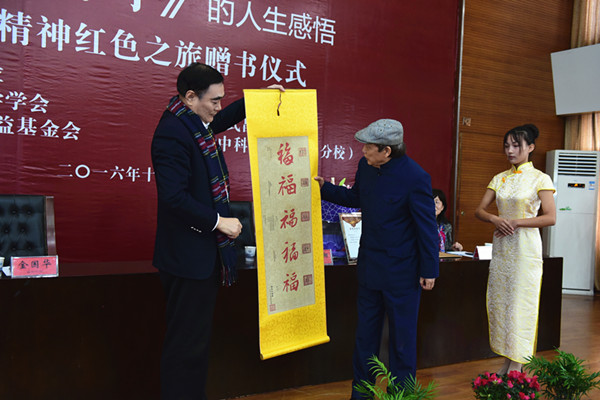 金国华理事长代表受赠单位致辞。万伯翱先生丰富的人生阅历及时代赋予的成长故事,不禁让金理事长回忆起自己的军营生活,勾起了他对自己参战经历和扎根于安徽大别山那段艰苦岁月的无限怀念和感慨,同时追忆起原全国人大常委会委员长、亲民务实的万里先生对安徽农村改革作出的突出贡献。万伯翱先生的到来,让他倍感亲切,对万老给予学校的支持表示衷心感谢,希望广大师生不负老一辈期望,爱读书、读好书、善读书,用书籍净化心灵,提升内涵,指导人生。