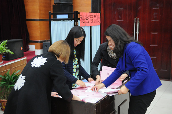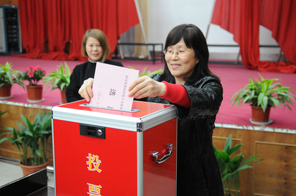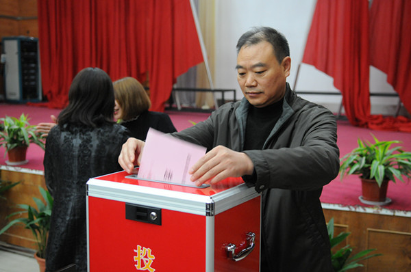 16日下午2点30分,校领导周进、金国杰、邹星庐与广大选民一起,认真填写选票,并依次走向票箱,郑重地投下自己的选票。洪山区委选举委员会等相关同志出席选民投票大会。