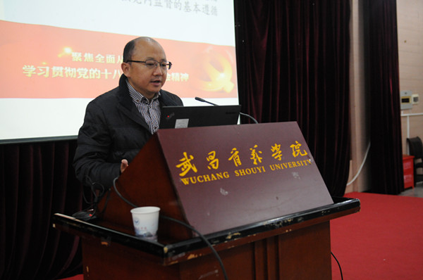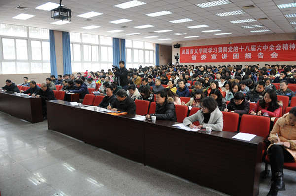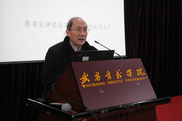 11月24日上午,湖北省委宣讲团成员、中南财经政法大学马克思主义学院院长龚先庆教授莅校作党的十八届六中全会精神报告。党委书记冯向东、副校长金国杰、党委副书记邹星庐与近300名师生一同聆听报告。