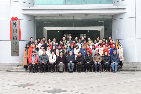 冯向东、徐秋梅为外国语学院揭牌。与会领导、外国语学院全体教师在学院门前合影留念。