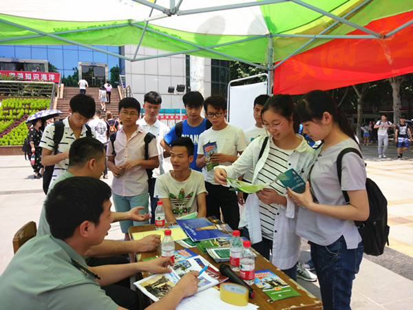 5月26日,学校举办“2017年征兵宣传日”活动。江汉区人武部张志国部长、军事科彭文科长、刘锐参谋,应邀来到现场接受学生咨询,为同学们宣讲政策,答疑解惑。