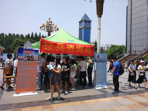 活动现场,军歌嘹亮,振奋人心,同学们纷纷驻足观看征兵宣传展板。来自金融专业的退役士兵汝同学现身说法,与同学们分享了她在服役部队的经历。报名登记现场,来自机电2015级、计应(专)2016级,同住一个寝室的男生们相约一道前来,环境设计专业的应届毕业生吴同学刚从外地实习回来就赶到现场报名,还有家长亲自陪孩子前来咨询。江汉区人武部的干部们耐心为大家讲解政策,并结合学生实际,为他们在军营的成长发展给予规划与指导。