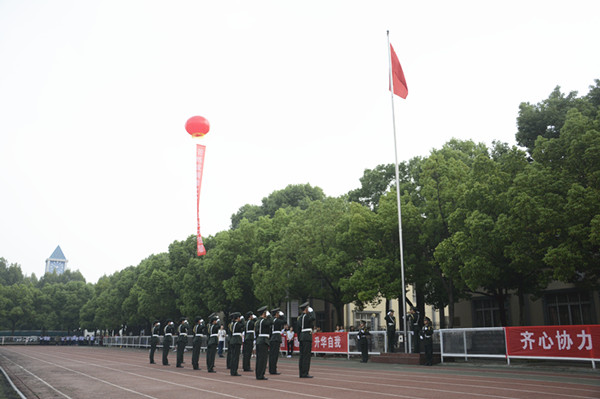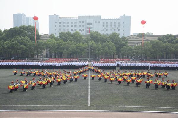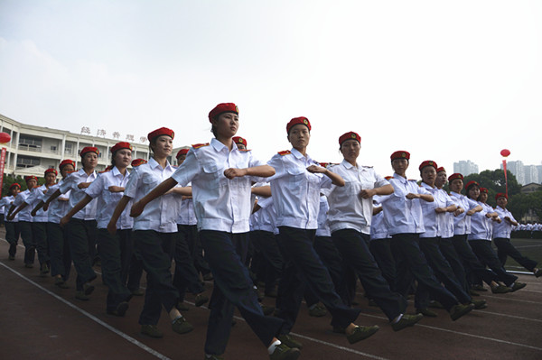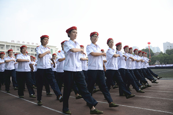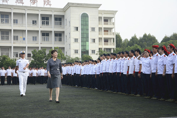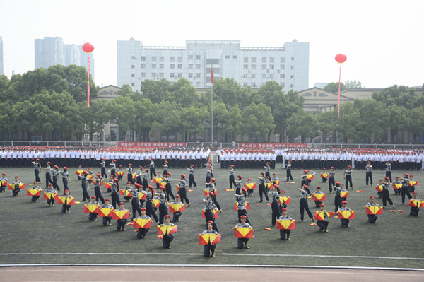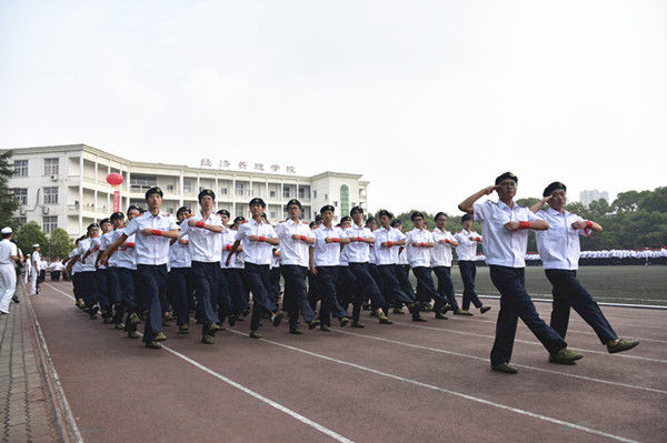 庄严的国歌声中,五星红旗缓缓升起,2017级新生身着白色军装,整齐列队,等待检阅。周进校长走向他们,频频挥手致意,“首长好”“为人民服务”的口号声此起彼伏,坚定响亮。