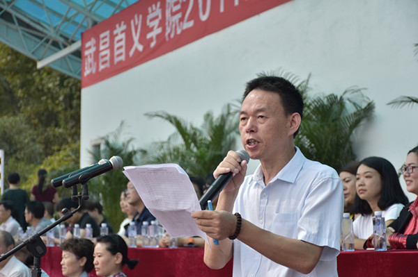 金国华理事长发表讲话。他首先代表学校理事会和全体校领导向完成军训任务的同学们表示衷心祝贺,向全体教官表示感谢。他说,人生要有梦想,同学们已经圆梦大学,但面向未来,要有更大的梦想。武昌首义学院办学17年,一直坚持“一个中心,四个提高”的理念,取得了优异的成绩。他深信同学们在这里可以实现更美好的人生梦想。最后他希望同学们刻苦学习、完成学业,为学校发展提供正能量。