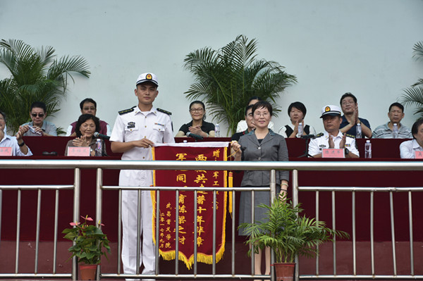 汇报表演结束后,党委副书记邹星庐宣读军训表彰决定。10支军训方队,2支表演方队,136名优秀学生,以及9名政工干部荣获表彰。周进校长代表学校向海军工程大学赠送锦旗。