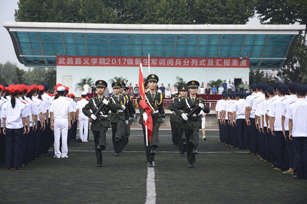 伴随着嘹亮的口号,军训汇报表演开始。由艺术设计学院领队的五营二连和新闻与法学学院领队的五营三连别出心裁,艺术设计学院的男生在左手绑着象征着青年学子报效祖国拳拳之心的红丝带,新闻与法学学院的女生回归质朴扎起了麻花辫。来自信息科学与工程学院的170名男生组成的军体拳方阵,他们身形矫健、拳脚敏捷、动作整齐、沉着有力,双脚落地开山炮,两拳出击挟飓风,展示出首义学子的龙虎声威。接着,由经济管理学院100名女生组成方队表演彩旗舞《军中姐妹》。音乐响起,舞蹈一开始呈旗子形状,象征着我校莘莘学子们展翅飞翔,拥抱阳光,奔向明天的辉煌,然后逐渐摆出五角星形状,寄寓着学校在未来再谱华章,更加辉煌。
