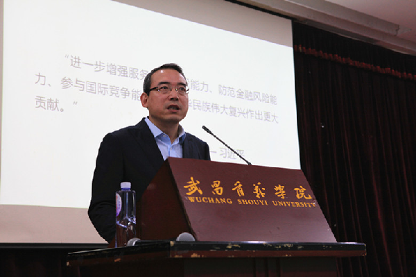 为深入贯彻落实银监局、省金融办、省教育厅规范校园贷,净化校园金融环境相关文件精神,10月11日上午,学校特邀中国建设银行湖北省分行党委委员、副行长周辉东莅校作以“树立健康消费观 拒绝不良校园贷”为主题的金融知识宣传普及教育讲座。理事长金国华、常务副校长吴昌林、党委副书记邹星庐与各院党总支副书记、辅导员、学生代表共同聆听。