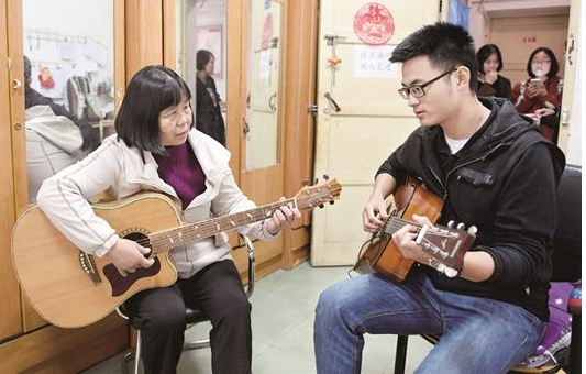 一个音乐零基础的宿管阿姨,捡回一把别人丢弃的吉他,从此迷上了拨弦弄音;两届大学生见到这样的情景,接力免费教她弹琴。故事源于去年9月,2013级电气专业的王子鸣和徐万天发现张阿姨独自拨弄琴弦后便主动上前教学,他们送给张阿姨一本入门的乐谱书并将指法和琴弦示意图画在小纸片上。经过他俩的耐心指导和自已的努力练习,两个月的时间,张阿姨便掌握了简单的曲谱。王子鸣和徐万天毕业后,同是电气专业的2015级谢雨鹏和周凡思便接力继续当起了老师,谢雨鹏还送给张阿姨一把新吉他。每当空闲的时候,他们就会主动去指导张阿姨弹吉他。如今,张阿姨已经可以完整的弹奏《两只老虎》了。