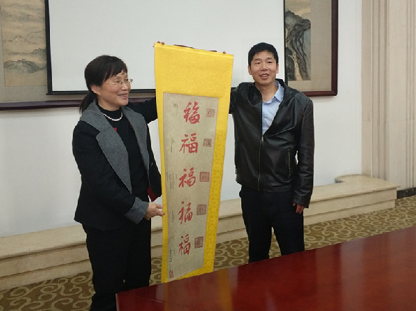 周进代表学校向美国应用技术教育联盟(中国)代表赠送礼物。