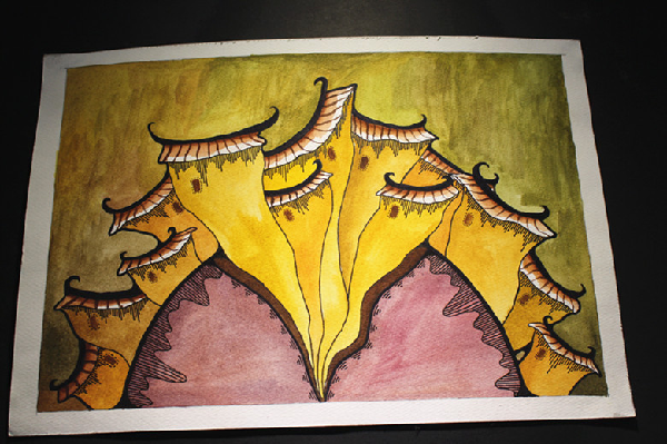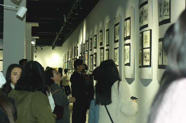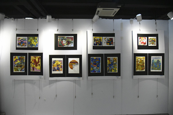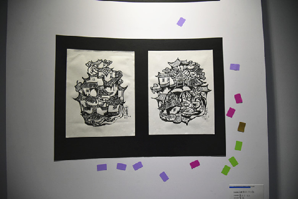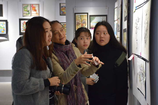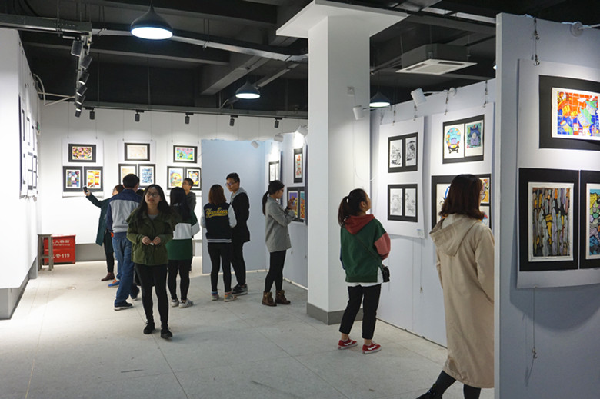 现场,三两成群的同学在一幅幅图画前驻足停留,老师们也对学生的作品给予点评。一幅描绘民居的抽象立体画吸引了过往老师和同学的注意,胡雨霞兴致勃勃地与同学们现场交流想法,她说,该作品展示了民居的特色,在外形上打破了架构的形式,体现了学生的创新思维。她还表示,在展览中深刻感受到了同学们的热情,希望同学们每一次都真心地、喜欢地去做事情,而不是被动完成作业。她很乐意和同学们进行创作赏析交流。