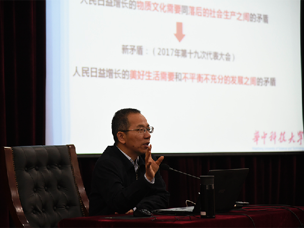 张建华教授指出,习近平新时代中国特色社会主义思想是党的十九大的灵魂,是把握党的十九大精神的“主线”。他总结道,党的十九大报告深刻回答了新时代坚持和发展中国特色社会主义的一系列重大理论和实践问题,描绘了决胜全面建成小康社会、夺取新时代中国特色社会主义伟大胜利的宏伟蓝图,进一步指明了党和国家事业的前进方向,是党团结带领全国各族人民在新时代坚持和发展中国特色社会主义的政治宣言和行动纲领。张建华教授认为,党的十九大报告提出的新时期社会主要矛盾的变化是理解党的十九大精神的切入点。他列举了过去5年中国社会经济发展、基础设施建设、科技创新等方面的详尽数据直观说明了党和国家发展进程中所取得的历史性成就。同样用系列经济数据,张建华教授指出了中国新时代所面临的机遇和挑战。