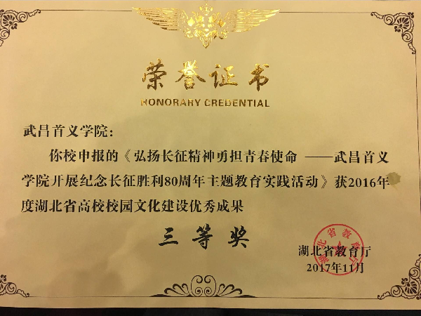 11月28日,湖北省高校2017年校园文化工作会暨湖北省高校校园文化研究会2017年年会在湖北文理师范学院召开。会议表彰了2016年湖北省高校校园文化建设优秀成果、高校网络文化建设优秀成果,部署了2017年校园文化建设优秀成果评选、网络文化建设优秀成果评选工作。校团委报送的论文《弘扬长征精神 勇担青春使命——武昌首义学院开展纪念长征胜利80周年主题教育实践活动》获三等奖。至此,学校已连续5年在此评选活动中获奖。