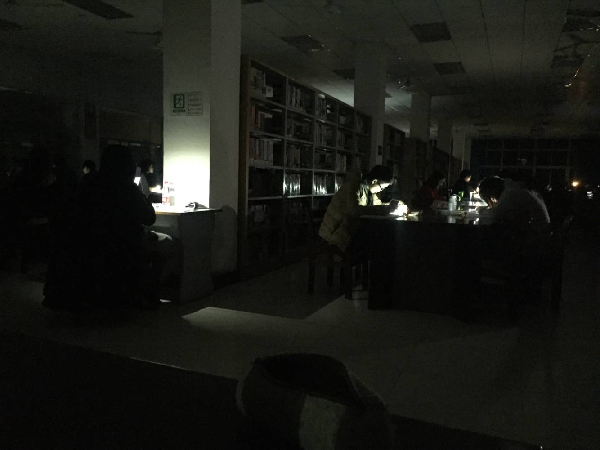 12月11日晚8点,图书馆中区分馆内突然“啪”的一声,所有的灯都熄灭了,原本安静的学习气氛被打破。出乎意料的是,在短暂的躁动后,大多数同学都拿出手机借助电筒光线继续埋头学习。